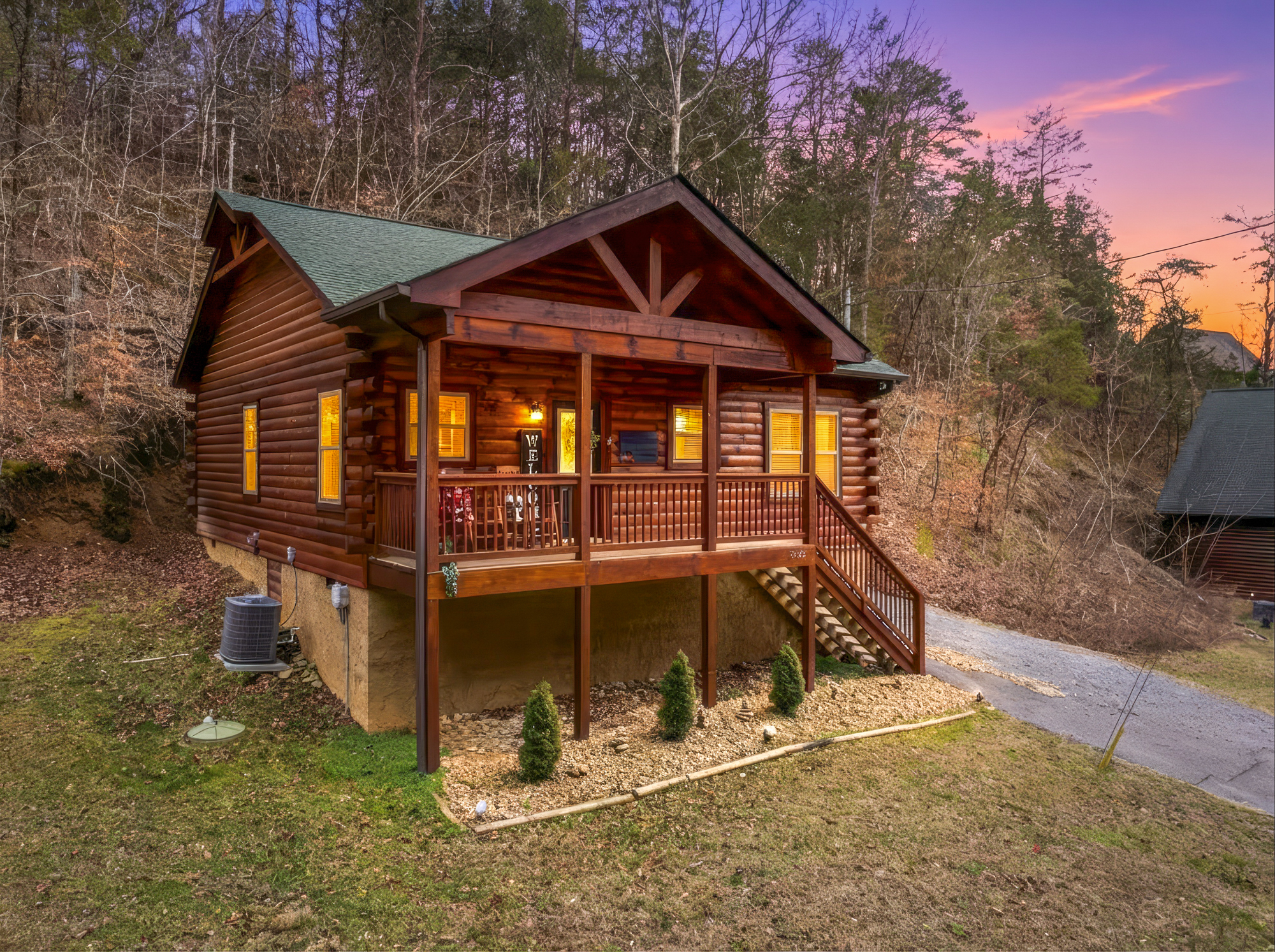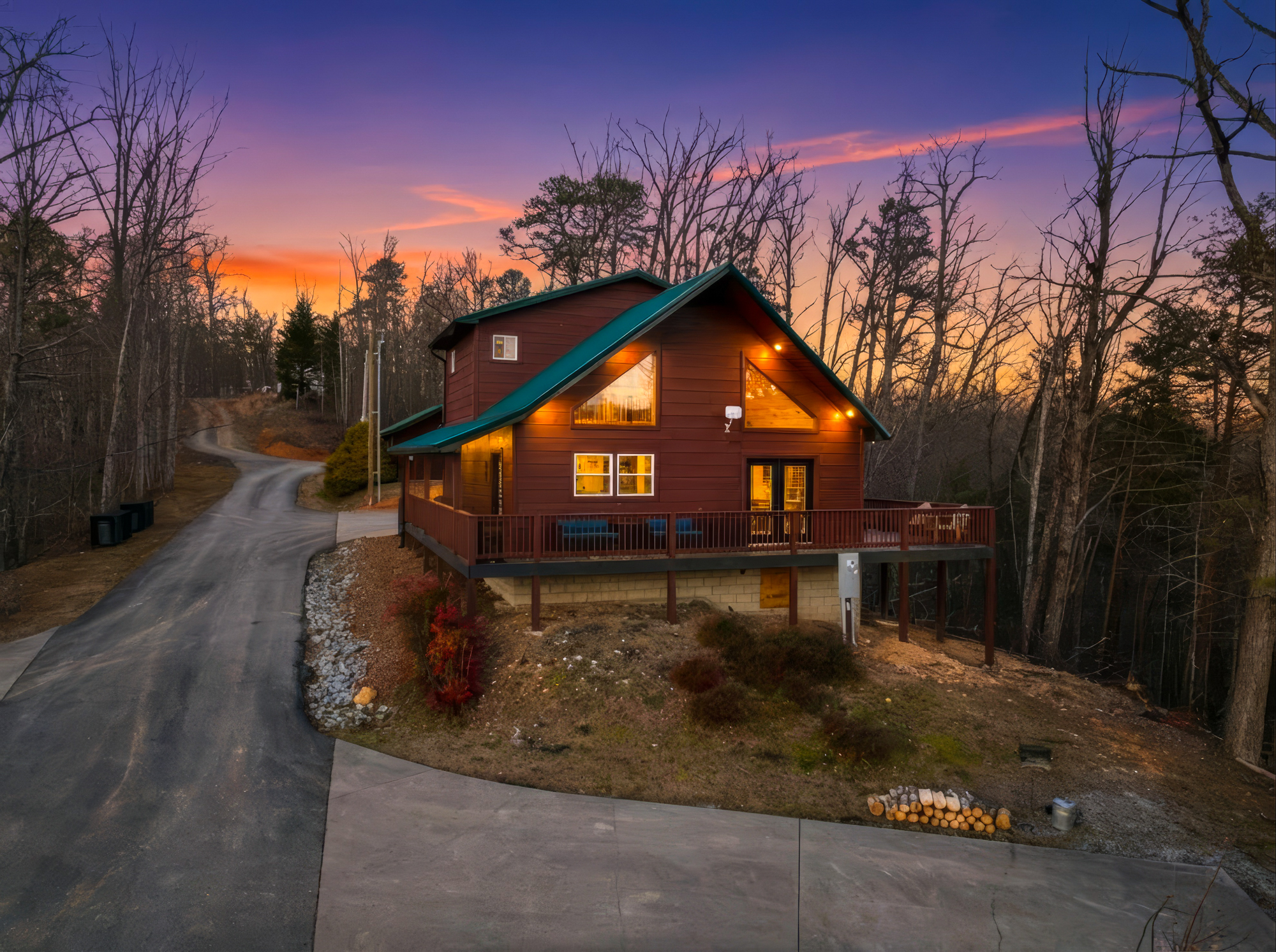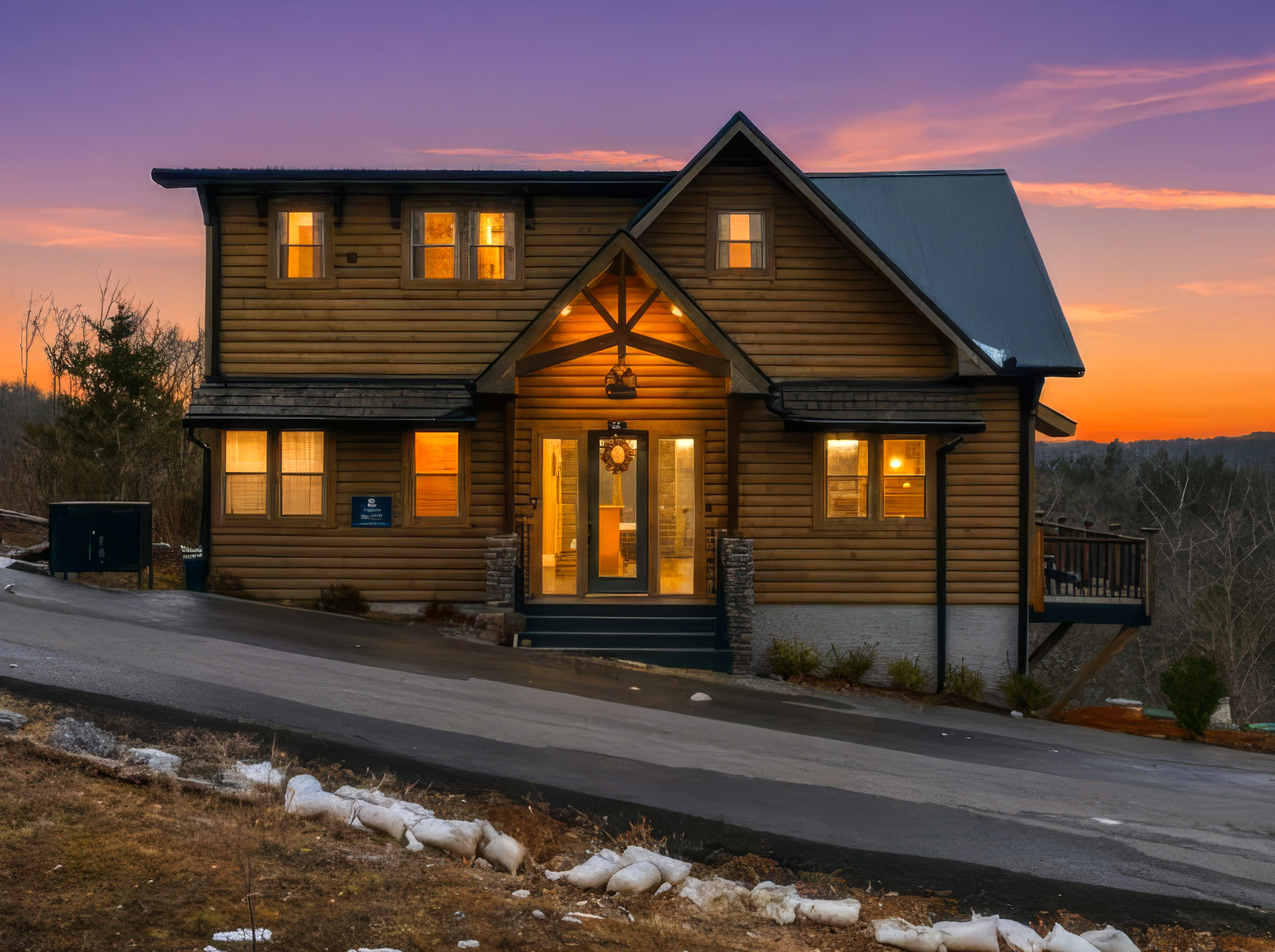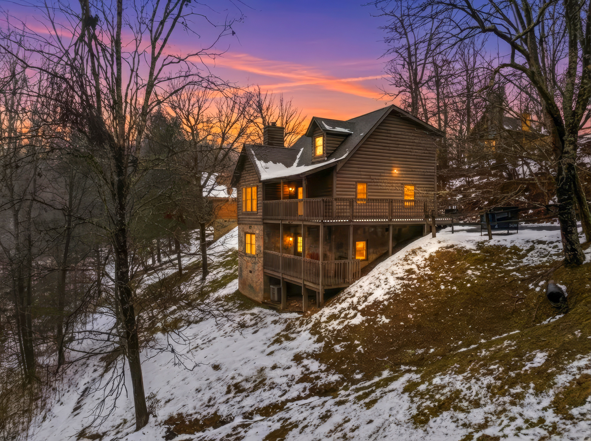 log cabin in snow at sunset with glowing interior lights in Sevierville Tennessee Smoky Mountains